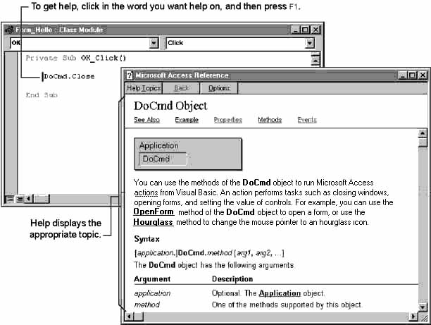 As with any of the other windows in Microsoft Access, you can get help in the Module window in any of several ways:
