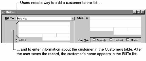 Note In the Orders form in the Orders sample application, all the fields from the Customers table are located on the Orders form, so users can add a complete record for a new customer directly in the fields on the Orders form. If you don't want to include all the fields from the underlying table on your form, you can still let users add a new record to it. When the user wants to add a row to a combo box, display a separate form with all the fields from the underlying table on it. After the user saves and closes this separate form, you can requery the combo box so the new item appears in its list. For an example of this approach, see the Developer Solutions sample application.