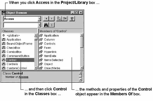 For example, if you click Access in the Project/Library box, all the objects in the Microsoft Access object library are displayed in the Classes box. If you then click an object in the Classes box, you can view the object's members