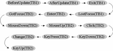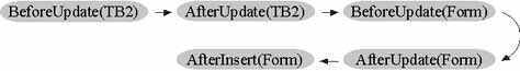 For example, if you update data in a text box (TB1) by deleting a character, then click a different text box (TB2), Microsoft Access triggers the following sequence of events: