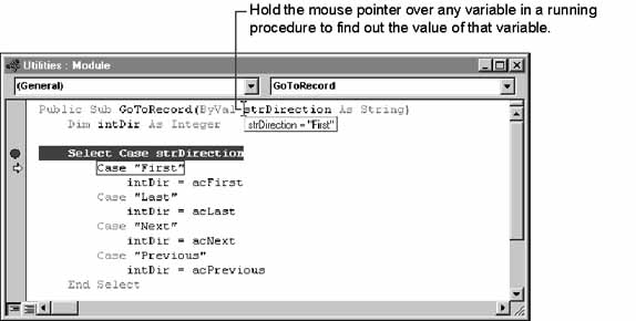 When you've interrupted a procedure that is running and you are viewing code in the Module window, you often want to know the current value of the variables you see. To find out the value of any variable or constant in the procedure that is currently running (the procedure with the yellow current statement indicator), rest the mouse pointer on the variable or constant. Microsoft Access displays a Data Tip directly underneath the variable or constant telling you its current value.