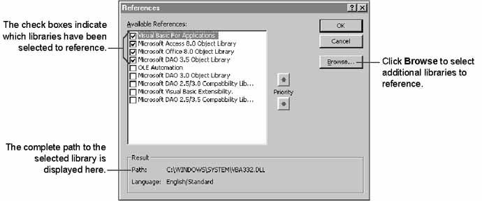 To get to the References dialog box, click References on the Tools menu when a Visual Basic module is open. The following figure shows how you can select libraries to reference.