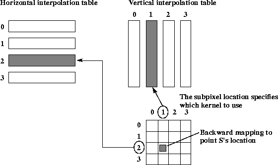Occasionally, these four options do not provide sufficient quality for a specific operation and a more general form of interpolation is called for. The more general form of interpolation, called table interpolation uses tables to store the interpolation kernels. See Section 8.2.5, "Table Interpolation."