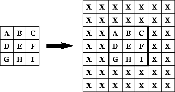 Some area operations, such as convolve, scale, and rotate, benefit from the addition of an extended border around the source image. The extended border comes into play when the convolution kernel overlaps the source image as the key value is scanned over it.