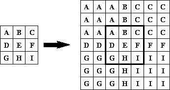 The BorderExtenderCopy class is a subclass of BorderExtender that implements border extension by filling all pixels outside of the image bounds with copies of the edge pixels. For example, Figure 7-4 shows the result of using BorderExtenderCopy to extend an image by adding two extra rows to the top and bottom and two extra columns on the left and right sides.