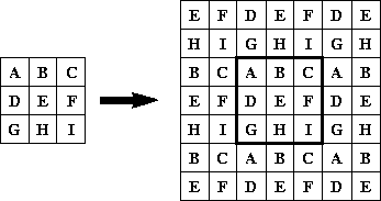 The BorderExtenderWrap class is a subclass of BorderExtender that implements border extension by filling all pixels outside of the image bounds with copies of the whole image. For example, Figure 7-5 shows the result of using BorderExtenderWrap to extend an image by adding two extra rows to the top and bottom and two extra columns on the left and right sides.