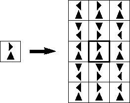 The BorderExtenderReflect class is a subclass of BorderExtender that implements border extension by filling all pixels outside the image bounds with reflected copies of the whole image. For example, Figure 7-6 shows the result of using BorderExtenderReflect to extend an image by adding two extra rows to the top and bottom and one extra column on the left and right sides.