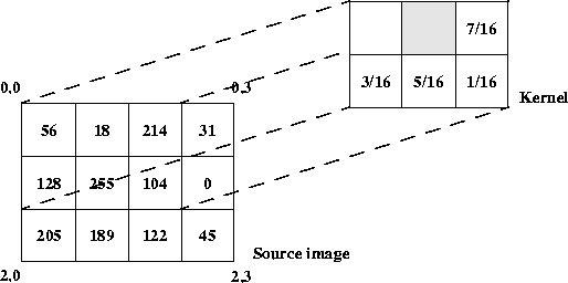 In operation, the filter is laid on top of the source image so that its origin aligns with the pixel to be passed through the lookup table. Figure 6-3 shows an example using the Floyd-Steinberg filter. The diffusion operation then: