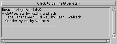 method (the method that looks up an applet by name) appears to convert the specified name to lowercase before looking for the applet.Below are two applets that illustrate lookup by name. The first, Sender, looks up the second, Receiver. When the Sender finds the Receiver, the Sender sends a message to the Receiver by invoking one of the Receiver's methods (passing the Sender's name as an argument). The Receiver reacts to this method call by changing its leftmost text string to "Received message from sender-name!".