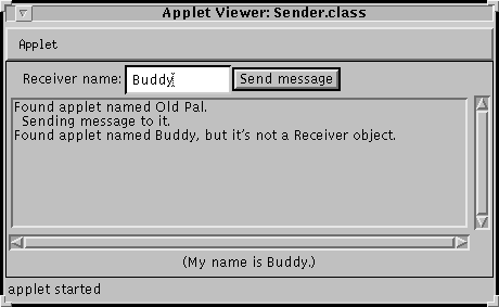 and press Return. Since "buddy" is the Sender's own name, the Sender will find an applet named buddy but won't send it a message, since it isn't a Receiver instance.Here's the whole Sender program. The code it uses to look up and communicate with the Receiver is listed below. Code that you can use without change in your own applet is in bold font.