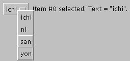 ), is the string from the selected item.Besides the methods used above, the Choice class defines these other useful methods://...Where instance variables are defined: Choice choice; //pop-up list of choices //...Where initialization occurs: choice = new Choice(); choice.addItem("ichi"); choice.addItem("ni"); choice.addItem("san"); choice.addItem("yon"); label = new Label(); setLabelText(choice.getSelectedIndex(), choice.getSelectedItem()); . . . public boolean action(Event e, Object arg) { if (e.target instanceof Choice) { setLabelText(choice.getSelectedIndex(), (String)arg); return true; } return false; } }