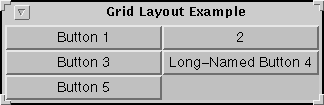 GridLayouts simply make a bunch of Components have equal size, displaying them in the requested number of rows and columns. Here's an applet that uses a GridLayout to control the display of five buttons.